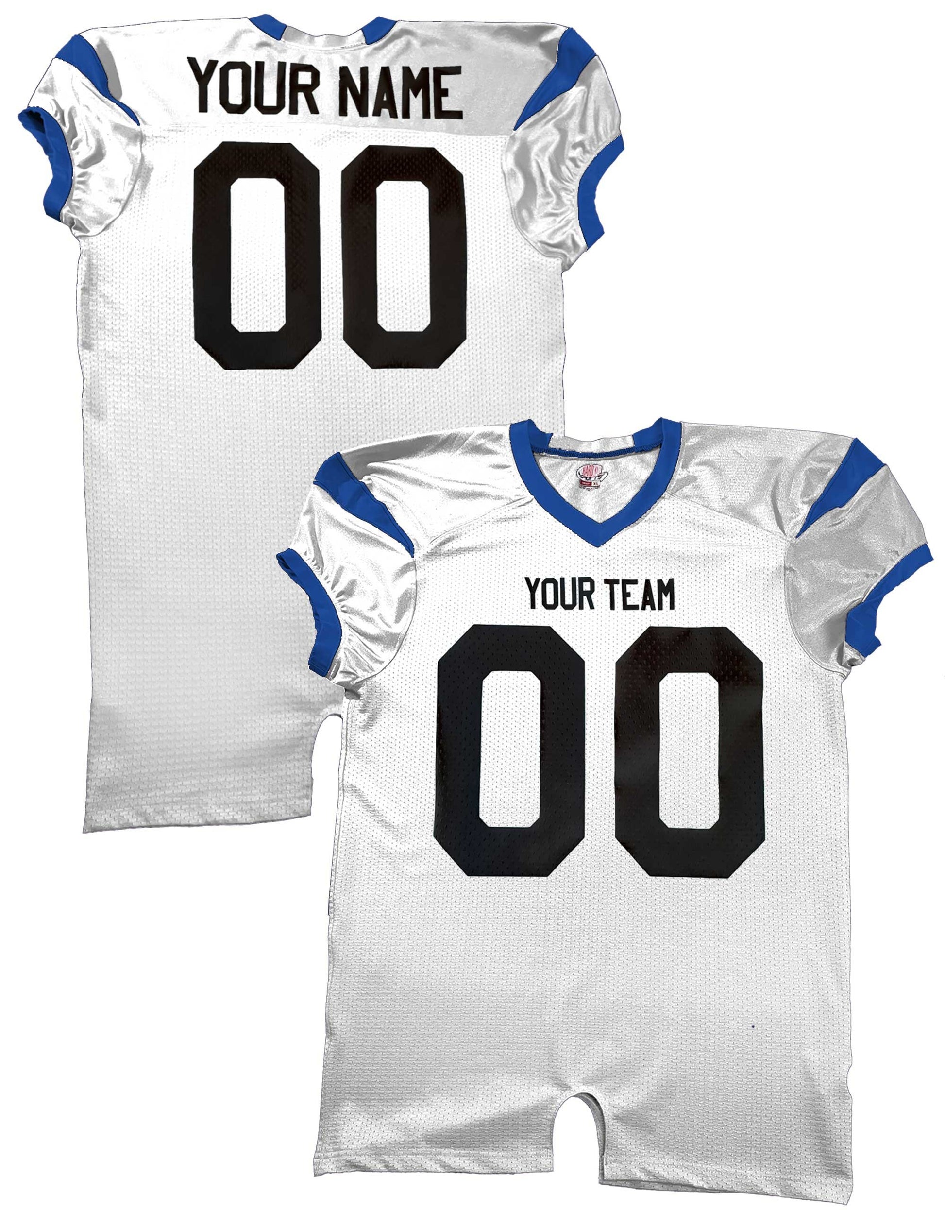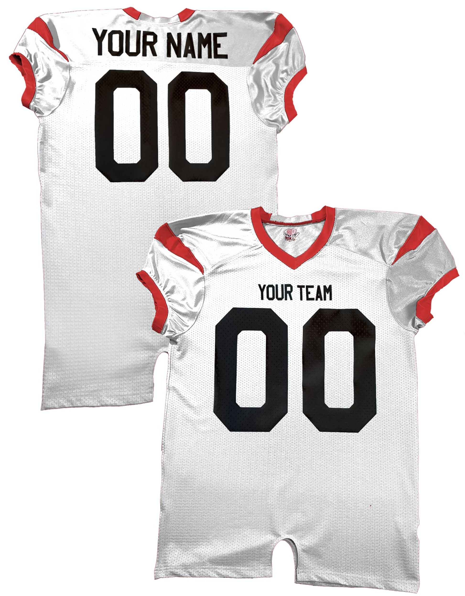This American Football Pro Fit Game Jersey, available in Red, White and Blue in addition to neutral black and white, offers a Professional Fit Custom for both College and High School players. Made with Patriotic design and a blend of Stretch Mesh and Dazzle Spandex, this jersey is perfect for any game.