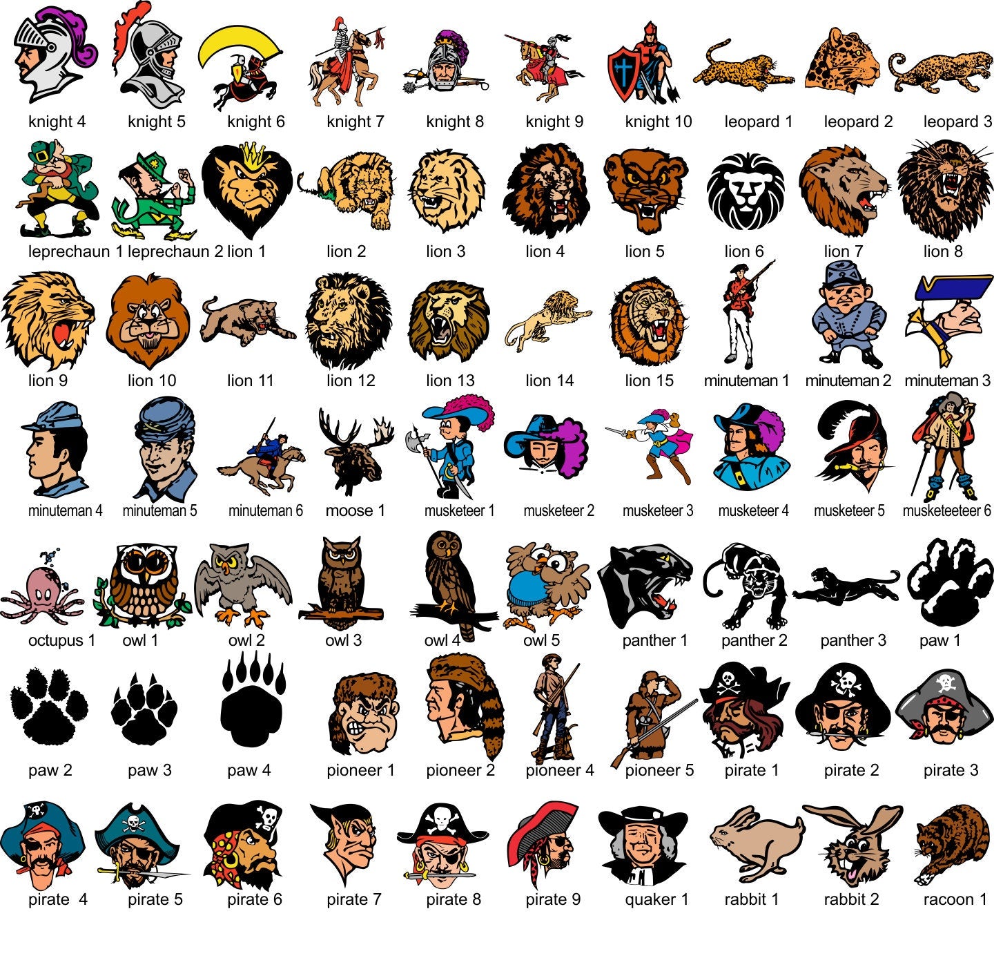 Select from a variety of 280 customized mascots and logos featuring your team name, player name, and numbers in full color graphics.