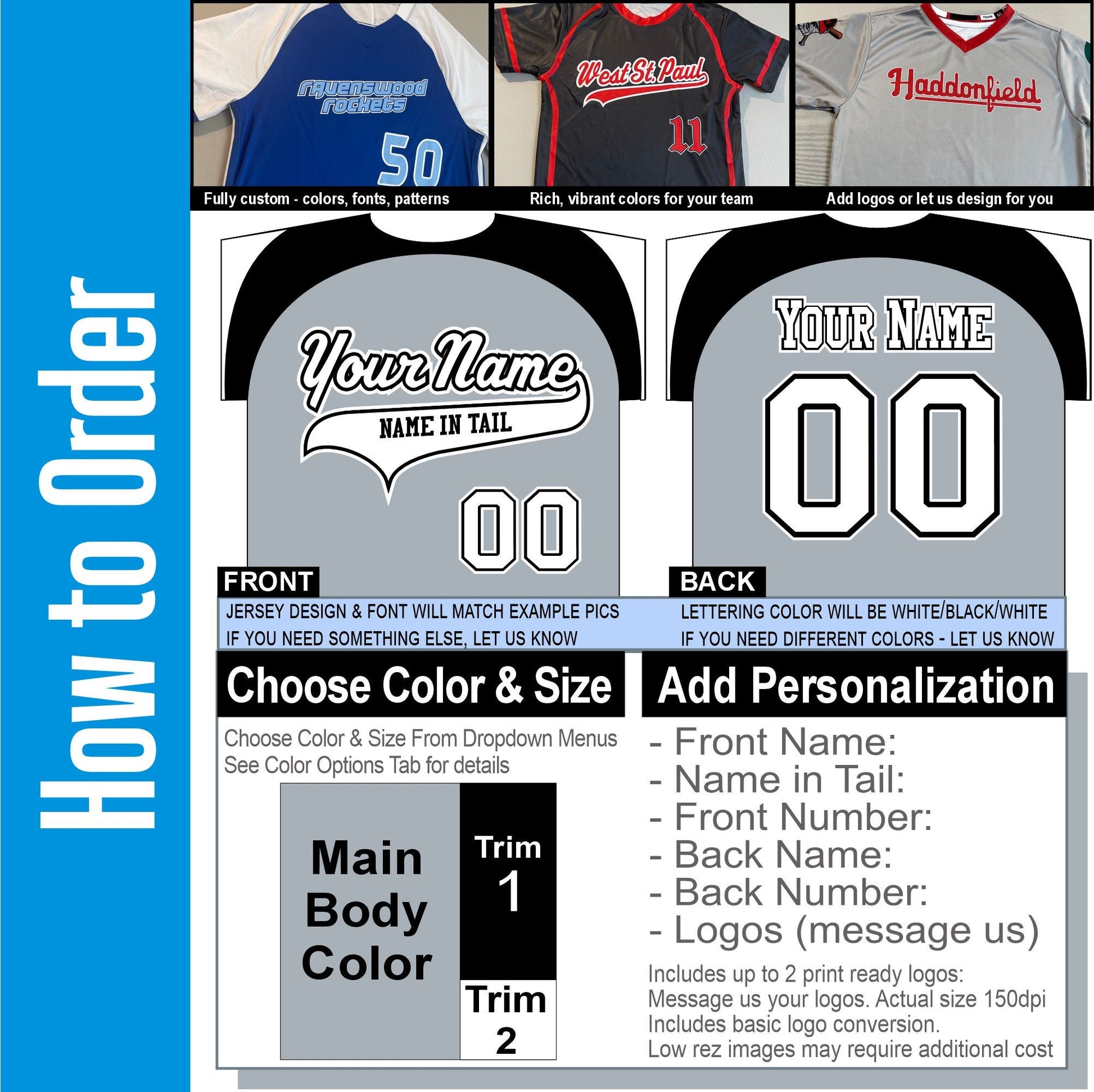 Materials: dye sublimated, professional design help, made to order, fully cut out and sewn together, free logo design included, your team name as a baseball logo, player numbers, player names, performance polyester, moisture wicking, crew neck design, lightweight and comfortable, add up to 2 custom logos