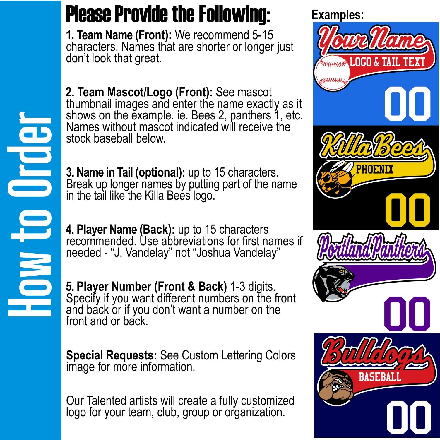 3. Name in Tail (optional): BASEBALL, HIGH SCHOOL, ETC.