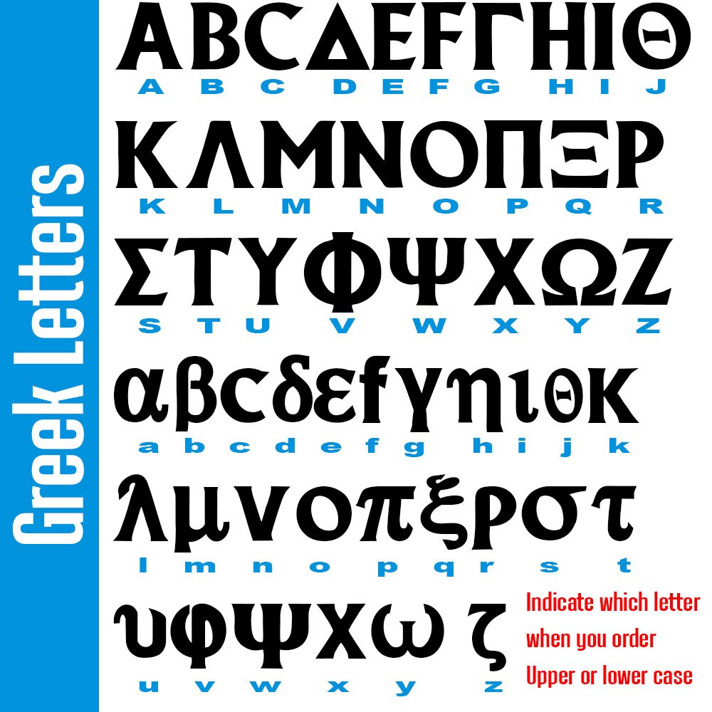 Greek letters are not a problem either. We offer a variety of lettering styles and can print greek letters in place of any of the team names or numbers. See the available options in the images and just indicate what letters you want. Reference the character you want by the corresponding letter in upper or lower case shown on the Greek Letters info tab.