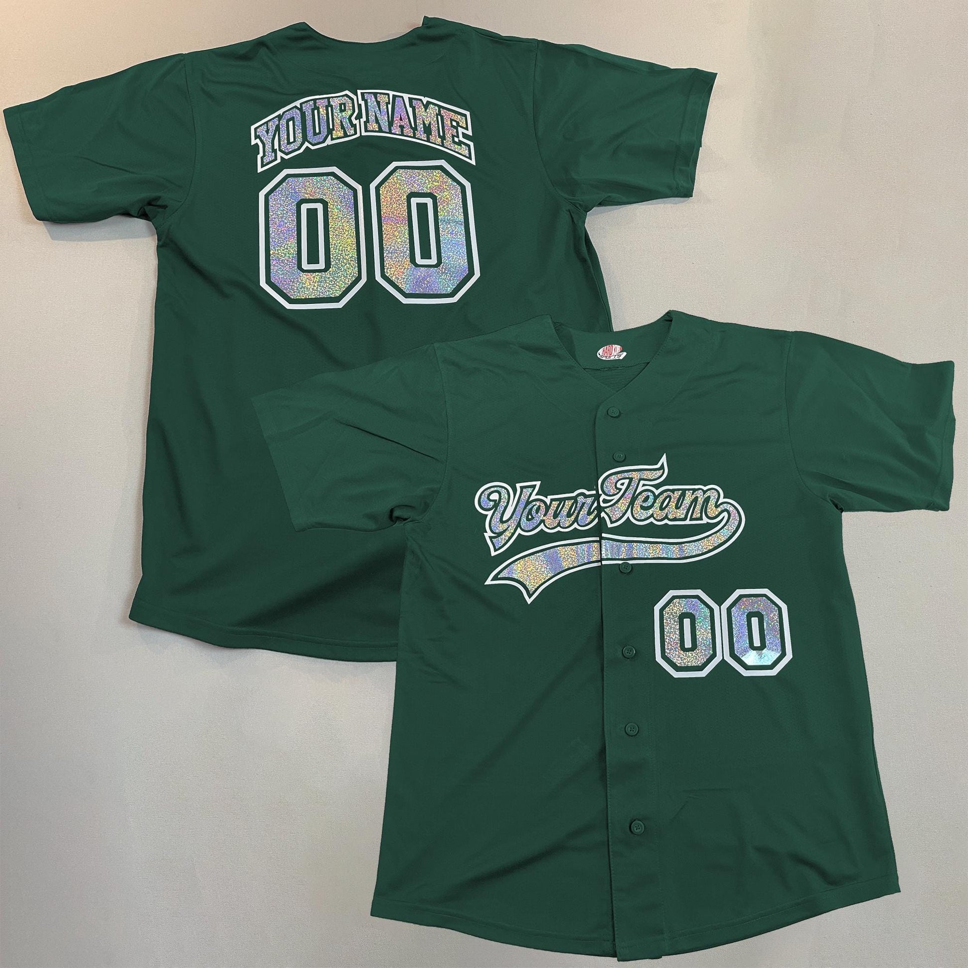 Stand out on the field with our Holographic Rainbow Silver Custom Baseball Jersey! This vibrant, eye-catching jersey features a dazzling rainbow silver heat-set vinyl material that shimmers with every move. Personalized with your team name in a funky, retro-inspired hippy font, this jersey brings a bold, unique flair to your game. The crisp white solid vinyl outline adds a clean, professional touch to the custom design.