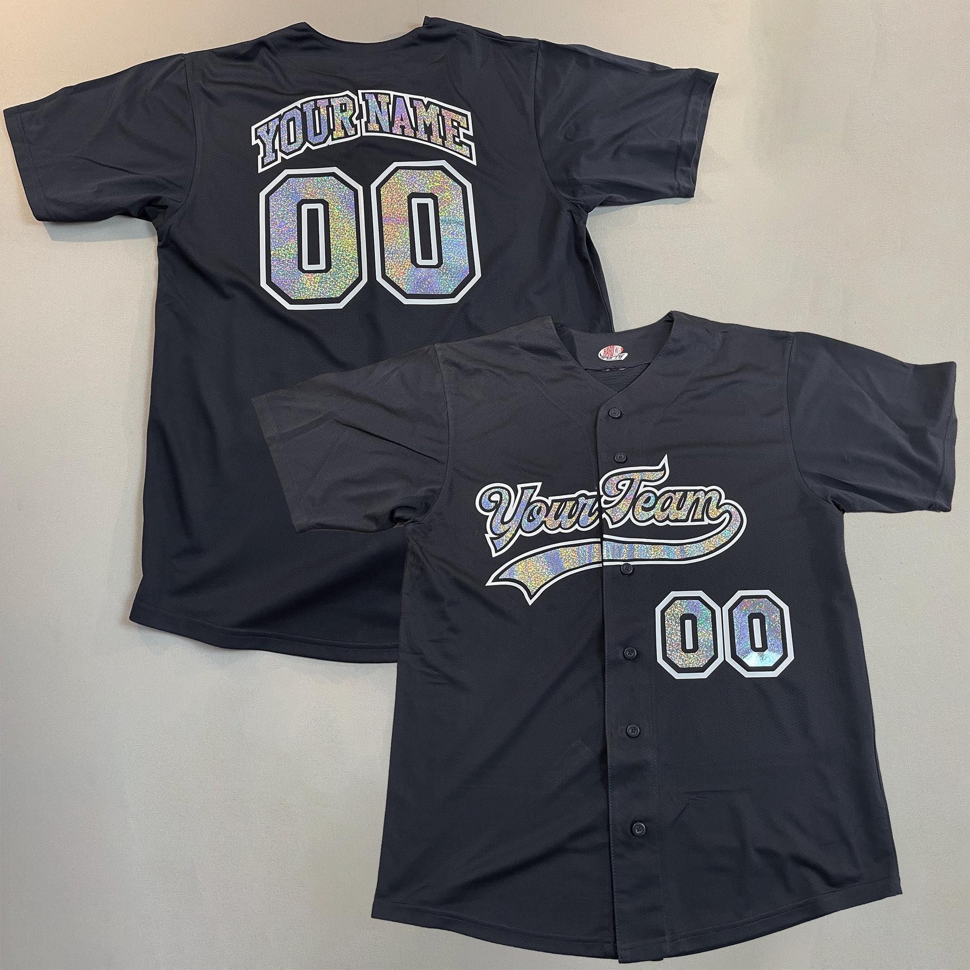 Rainbow Silver Hologram Print Custom Baseball Jersey with White solid Vinyl Outline, Personalized with your Team Name in a Funky Hippy Retro