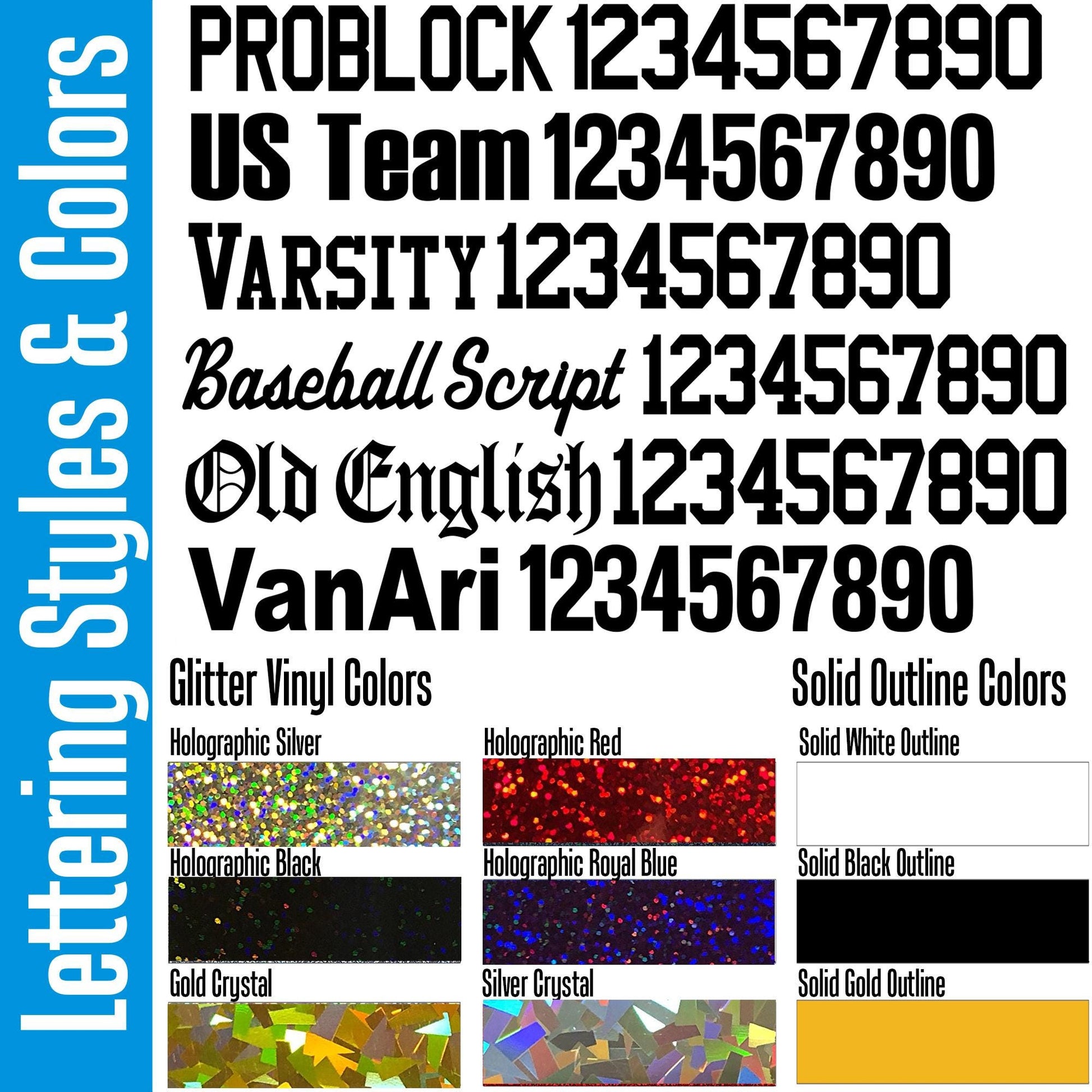 • Choose from 18 Lettering Colors. If you want a lettering color other than the default black and white shown please let us know. Lettering colors are white, black, royal blue , navy blue, scarlet red, athletic gold, dark green, kelly green, shark teal, columbia blue, orange, maroon, purple, pink, grey, old Missouri gold, Vegas Gold and Texas orange. Outline color choices are black or white and are available at an extra charge.