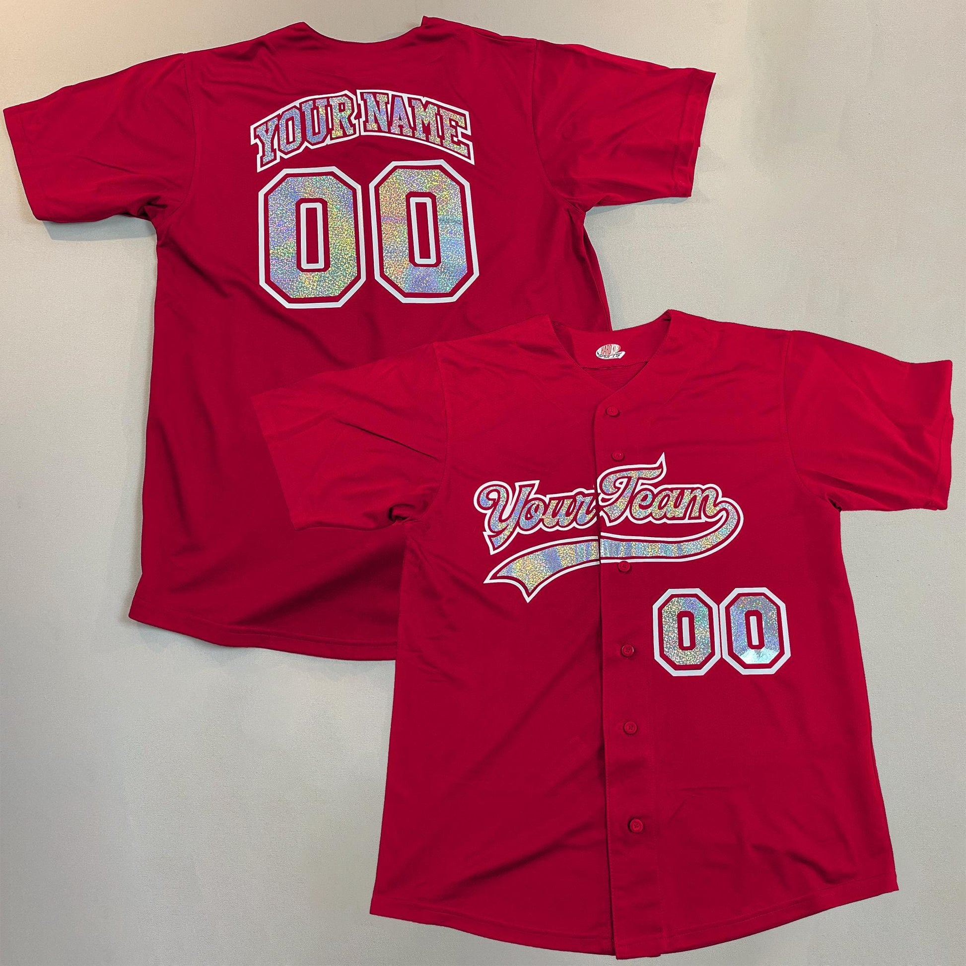 Materials: heat set vinyl lettering,moisture wicking,team name,player name,short sleeve,6 button,solid color,full button down,sparkly glitter vinyl,authentic sports team vinyl,holographic rainbow sparkle vinyl,authentic heat set holographic vinyl,holographic vinyl print