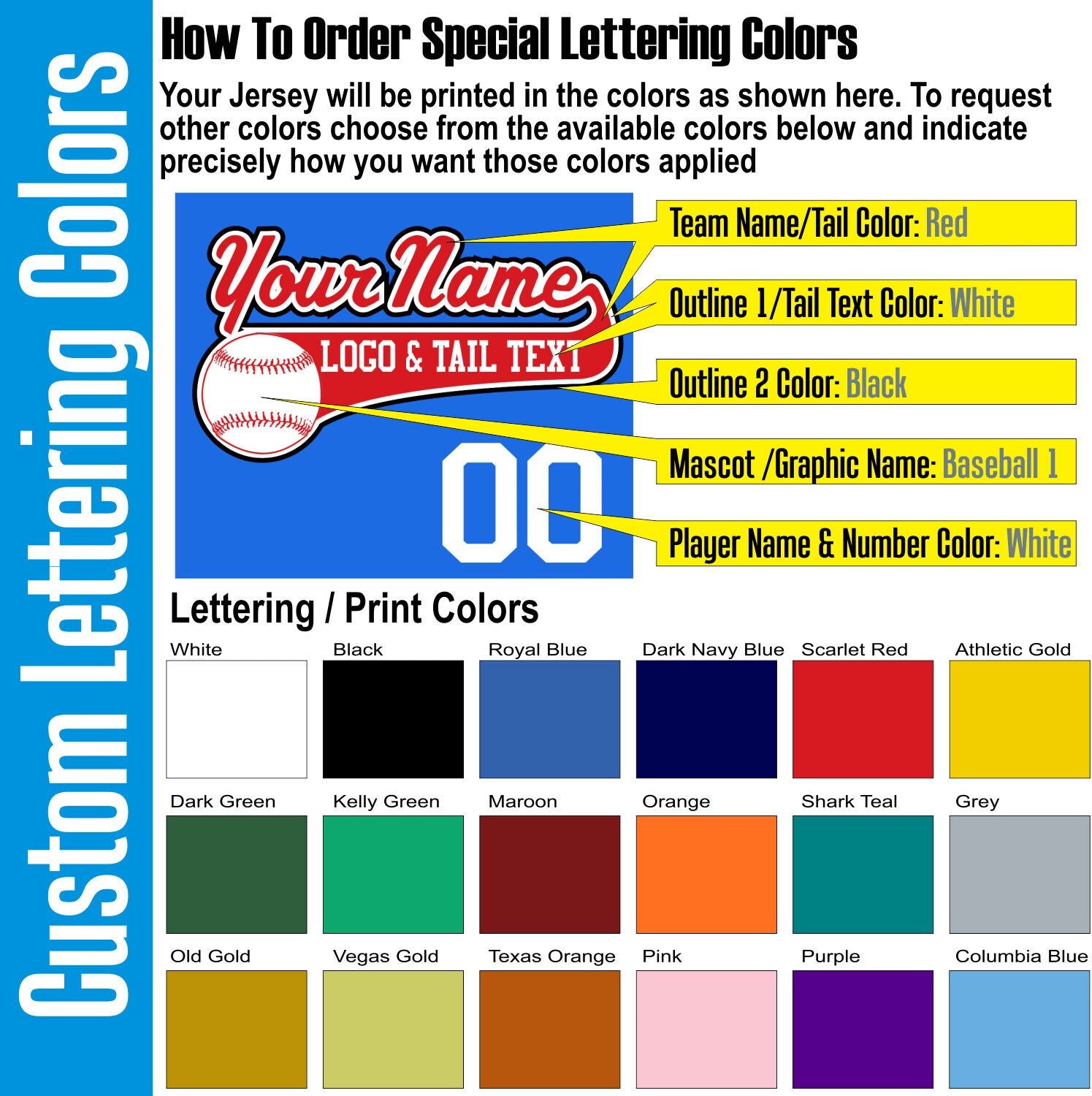 Choose from 18 Lettering Colors. The "Your Name" logo is 3 colors consisting of one primary color of your choice and a white and black outline. The back player name and numbers will be white or black, whichever has the most contrast to the garment. If you want something different - let us know! See lettering color tab for list of available lettering colors. Lettering colors are white, black, royal blue , navy blue, scarlet red, athletic gold, dark green, kelly green, maroon, orange, shark teal, grey, old Missouri Gold, Vegas Gold, Texas orange, pink, purple and Columbia blue.