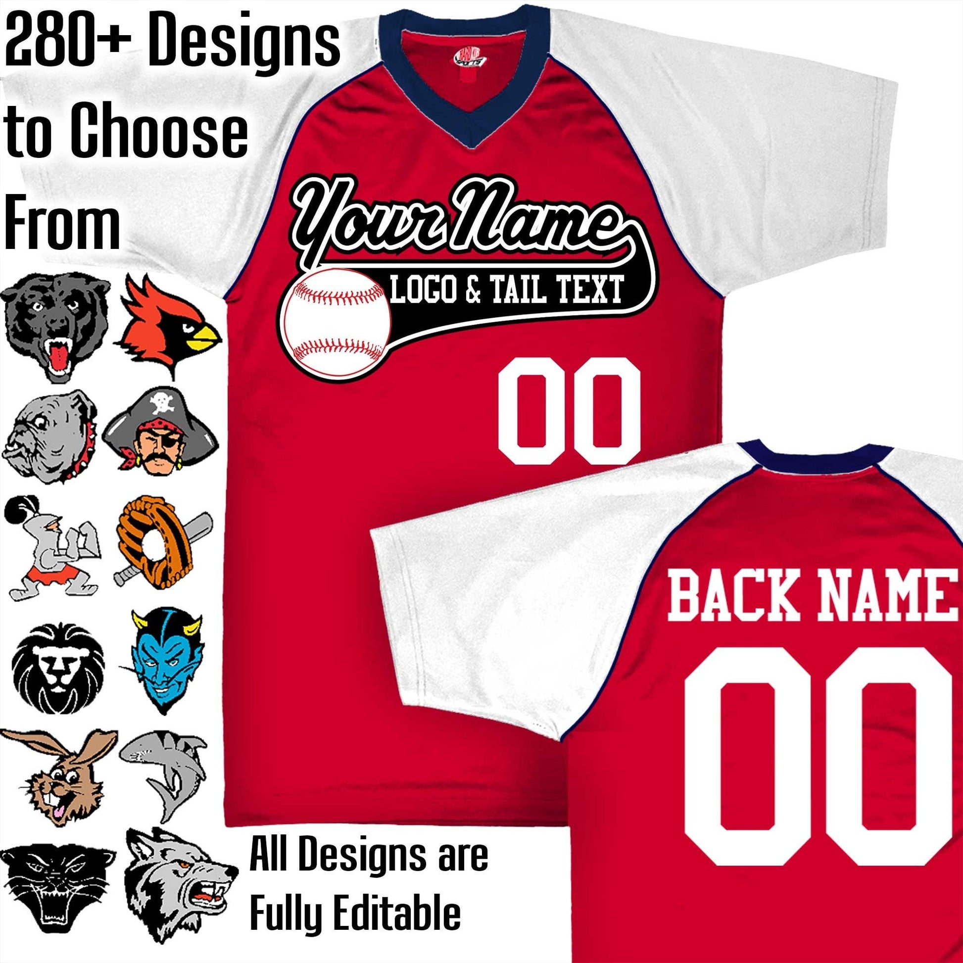 Scarlet Red, White and Navy Blue Customizable Baseball Jersey with Your Team, Player Name and Numbers Custom Baseball Logo
