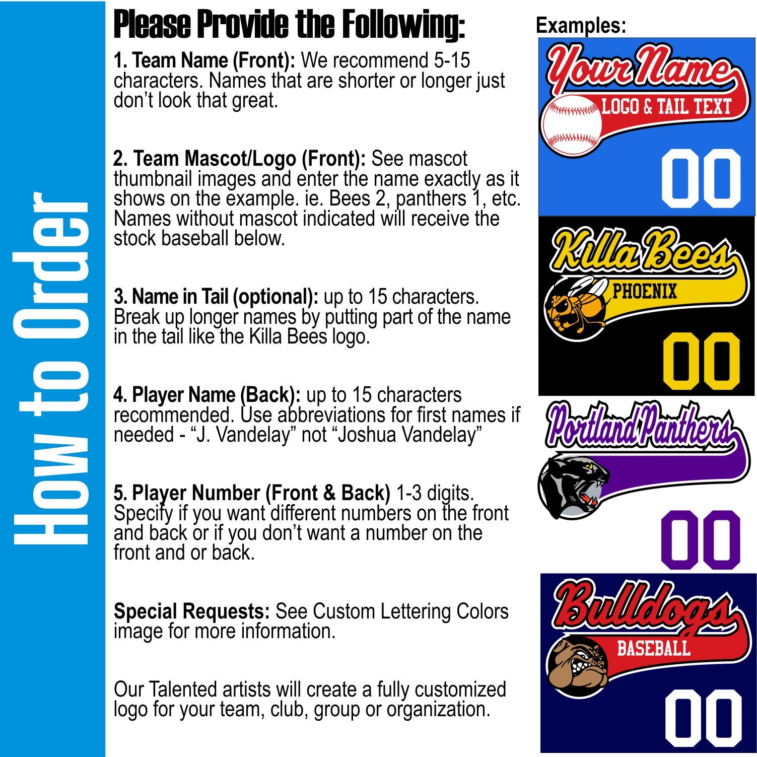 CUSTOMIZATION: Your team name, mascot, player name and numbers printed in your choice of colors and styles as shown on the product images or above.