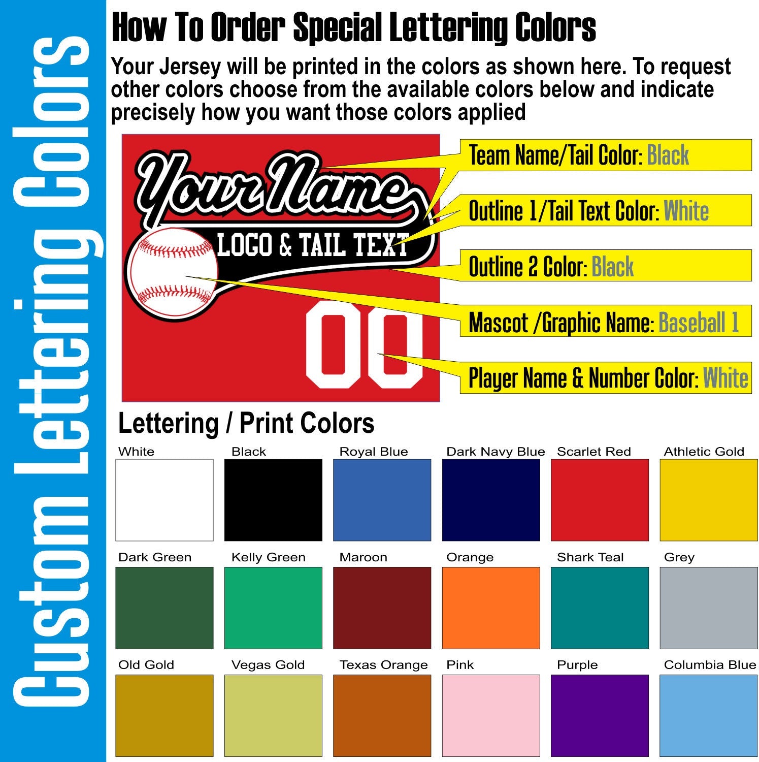 Choose from 18 Lettering Colors. The "Your Name" logo is 3 colors consisting of one primary color of your choice and a white and black outline. The back player name and numbers will be white or black, whichever has the most contrast to the garment. If you want something different - let us know! See lettering color tab for list of available lettering colors. Lettering colors are white, black, royal blue , navy blue, scarlet red, athletic gold, dark green, kelly green, maroon, orange, shark teal, grey, old Missouri Gold, Vegas Gold, Texas orange, pink, purple and Columbia blue.