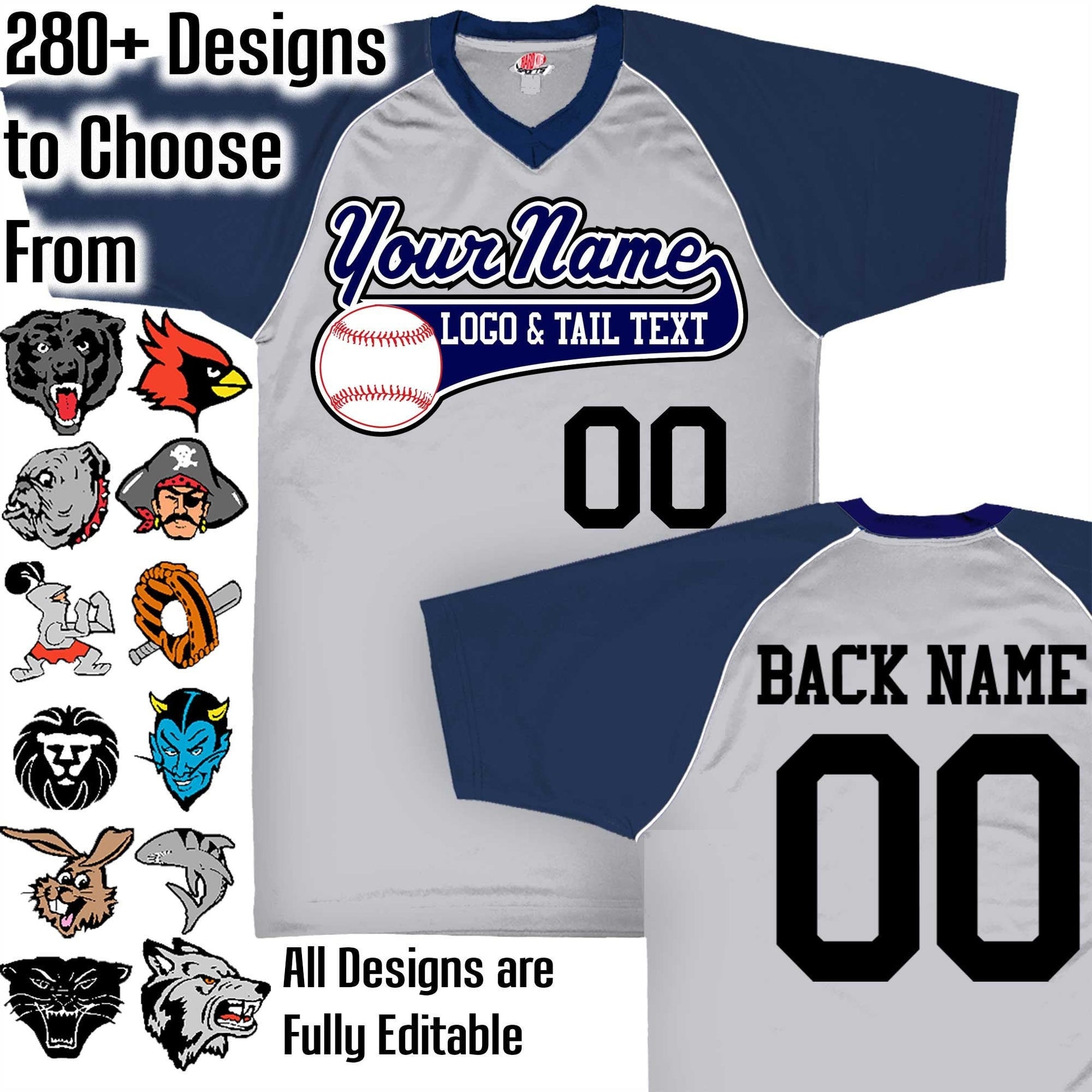 Choose from 280 custom Mascots and logos featuring your Team Name and create a unique baseball jersey in Silver Grey, Navy Blue or White team colors with accented, color coordinated designs. Personalize it with your Player Name and Numbers, and we'll print it on this cool jersey along with your name and number. Get a professional, educational, and objective custom baseball jersey with your team's logo and colors.
