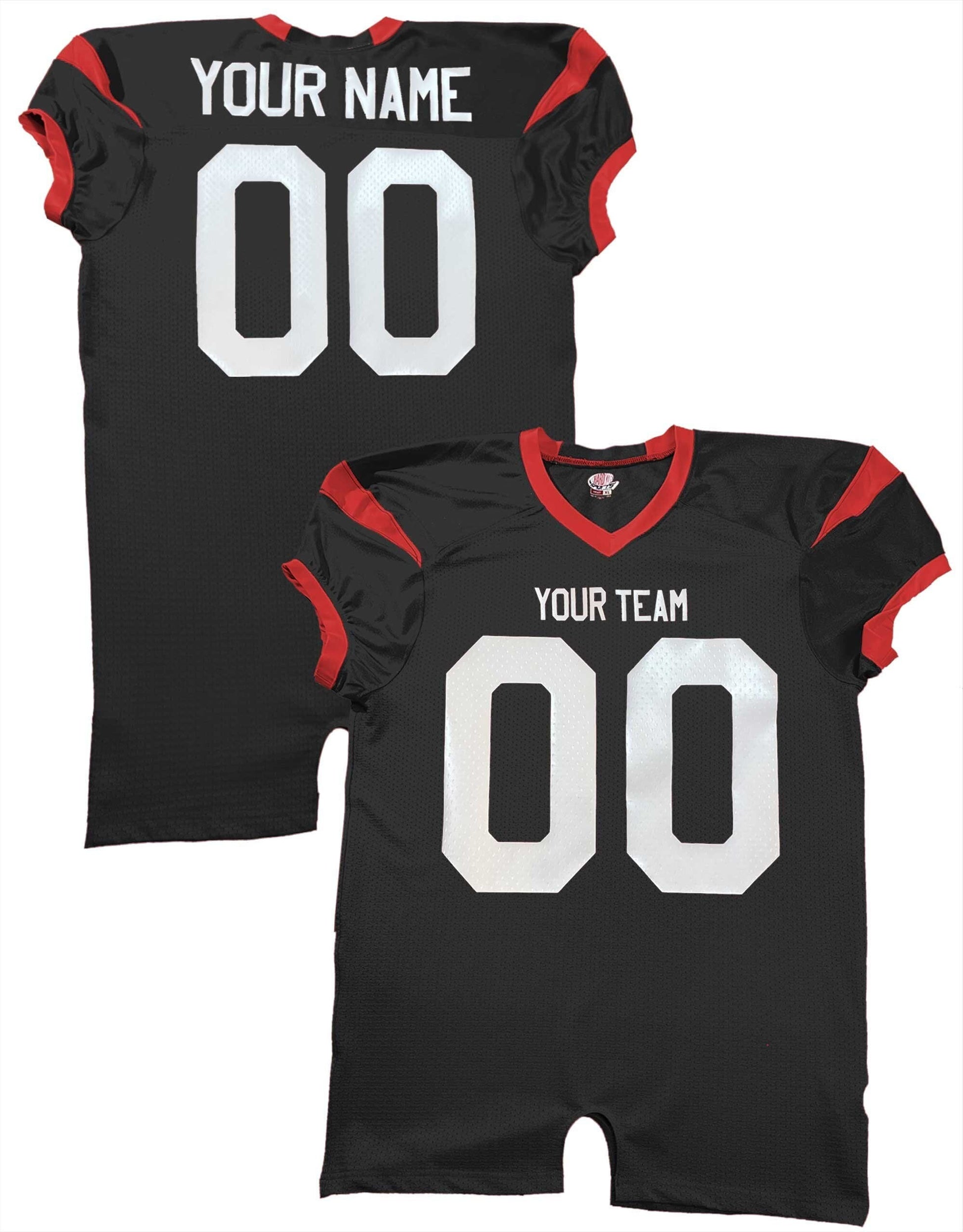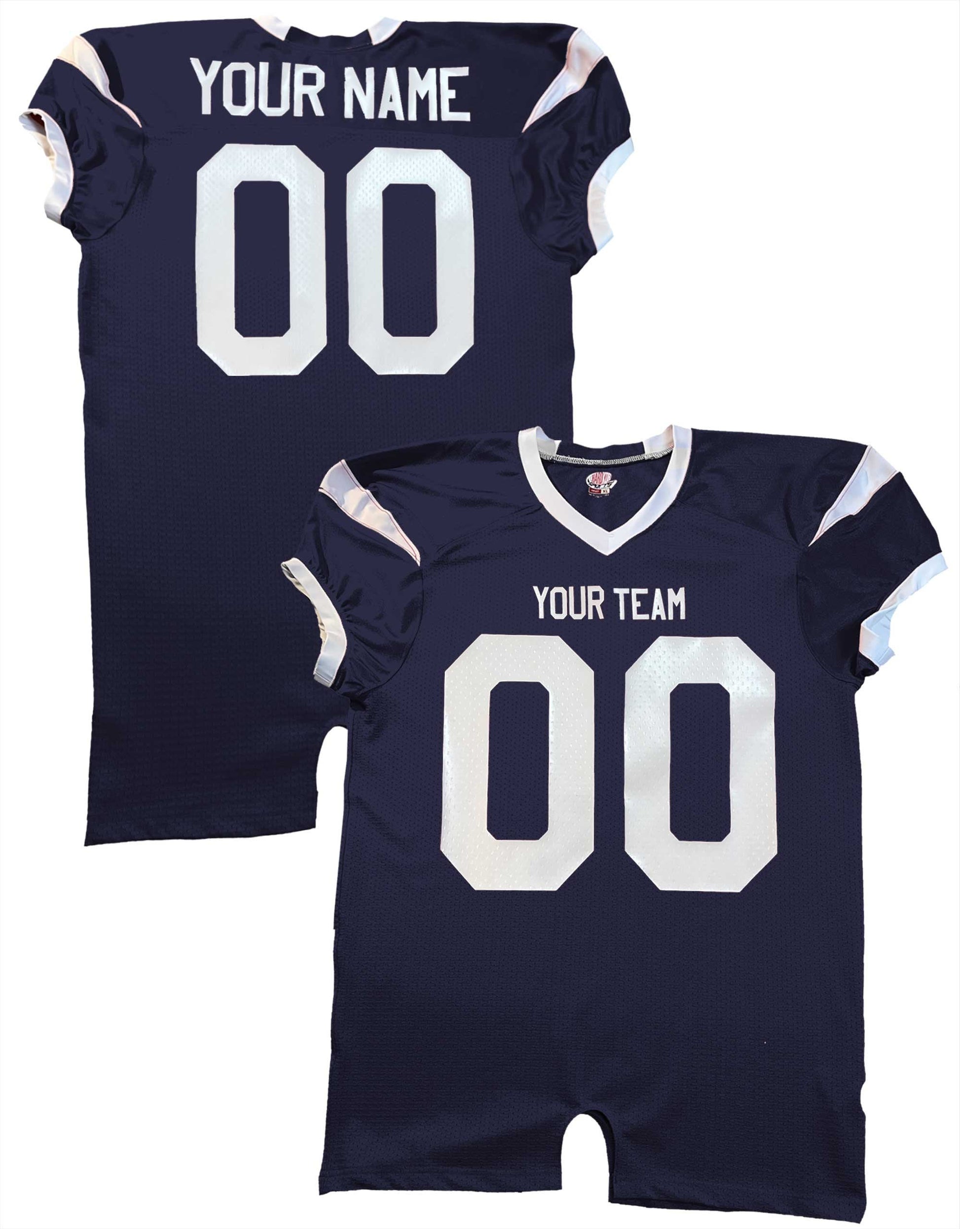 Discover superior style and comfort on the field with our Team Professional Game Fitted Custom Football Jersey in Black, Navy, and Gold. Constructed with a stretch mesh and dazzle fabric, this jersey features single-ply upper and side inserts, as well as double-ply cowl for added durability. The spandex side panels provide a snug fit, while the finished elastic sleeves and double hemmed bottom add a professional touch to this premium jersey.